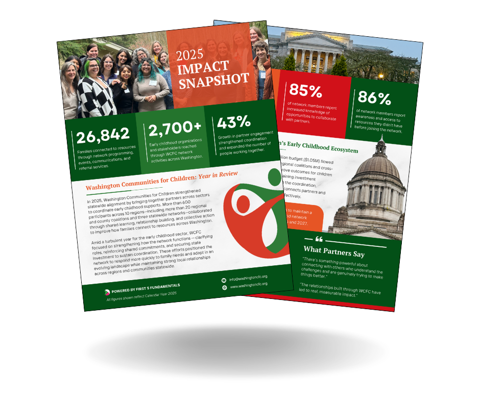 First 5 FUNdamentals is proud to share our first-ever Annual Report alongside 2025 Impact Snapshots from Family Connects Washington, Pierce County Early Childhood Network (PCECN), and Washington Communities for Children (WCFC).